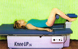 従来の牽引機の場合 ・・・症状の悪化する場合がありましたが、これは牽引方向が 正しくない場合や、大きな牽引力が作用したため反射性筋痙直を起こしたためと思われます。 また、腰部にベルトをセットして牽引するため、仙腸関節まで治療効果が波及することが 少ないと思われます。 ニーアップベッドの場合、患者の膝部を持ち上げることにより、患者の骨盤を浮かせ、患者の体重により 腰椎が全長にわたって前湾と反対方向に湾曲するので、腰椎の椎間関節の後方が開き、 したがって椎間関節の後方の圧迫が改善され、筋や靭帯の緊張が改善されます。 さらに、ニーアップベッドの場合、骨盤をセットしないため、骨盤の重みと、 筋力によりフリーになった仙腸関節が矯正されます。